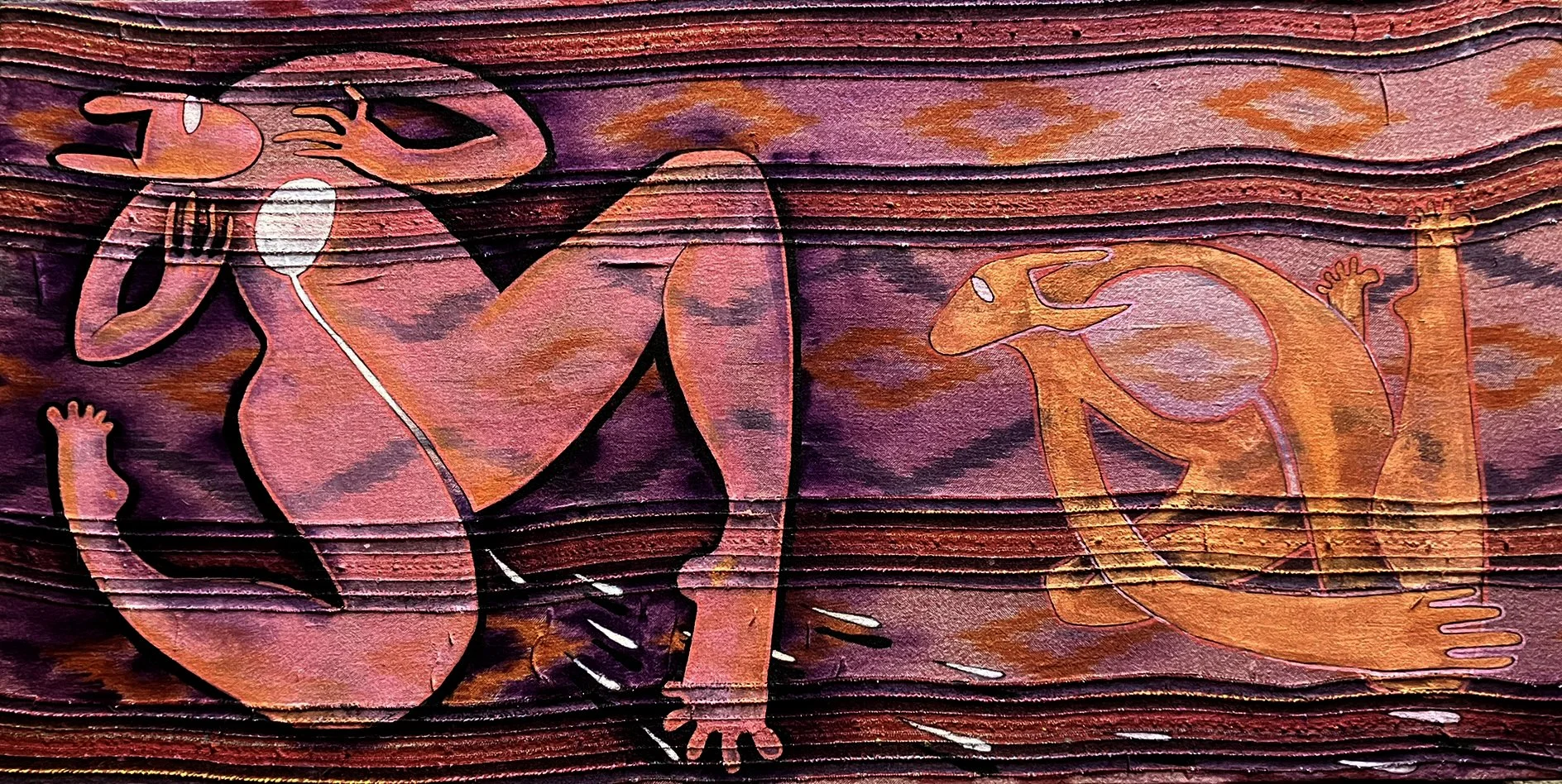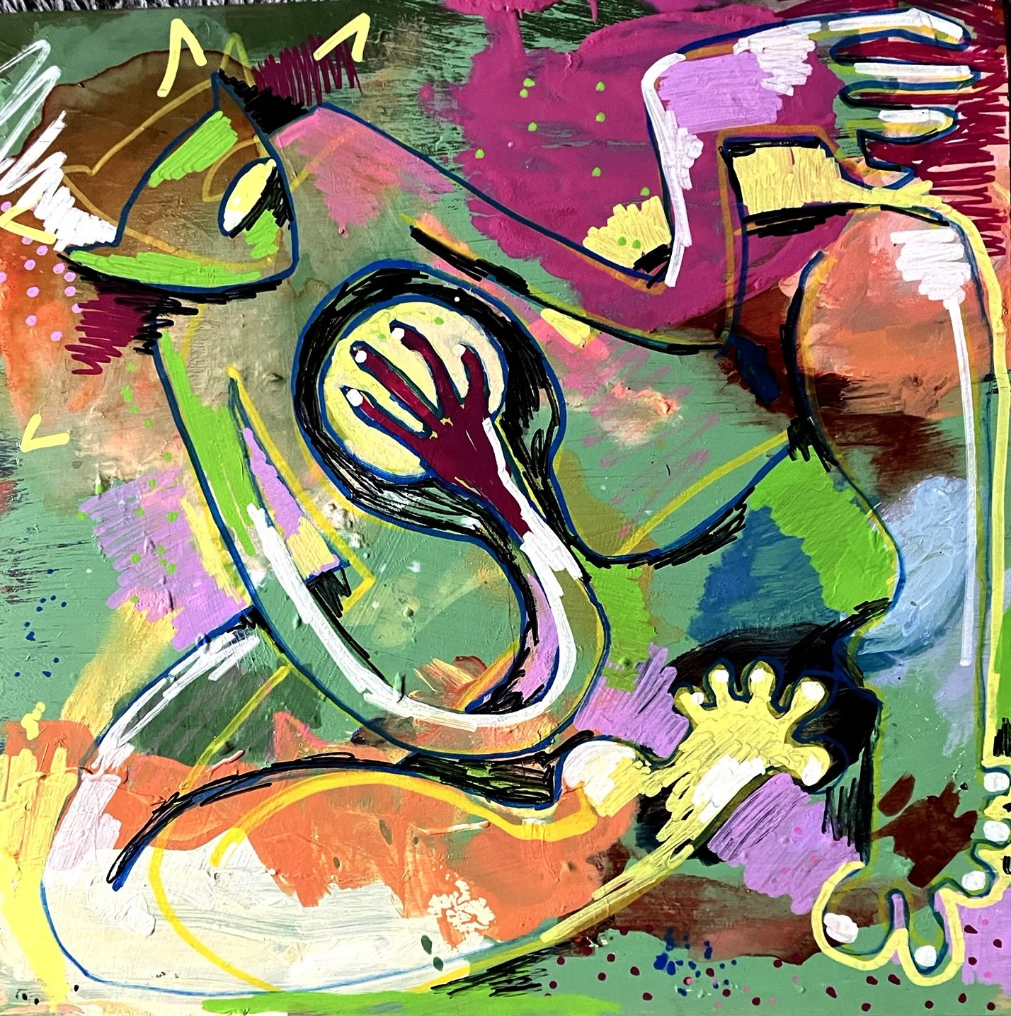 All paintings shown here are new since May of 2025. Mostly acrylic, fabric and posca marker on reclaimed canvases.