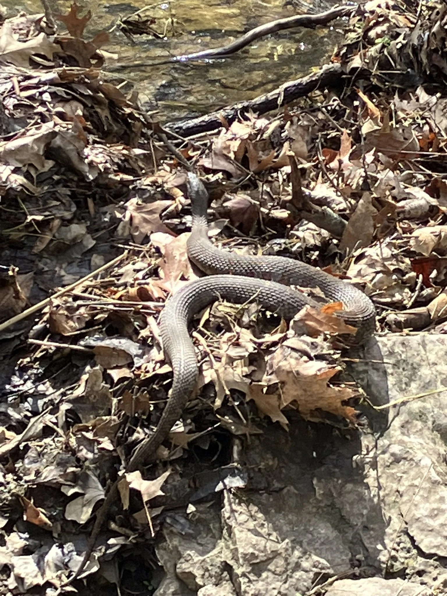 I am at the creek to practice teaching belly breath. So I sit at the perfect spot on the bedrock in the creek and place my little phone up to make a video. I am looking directly at this beauty — The First Wild Snake of the Year. And an absolute unit of one at last! I record my ten minute video as the dog runs (you can see her in the video, small in the background!) and as the snake perches.