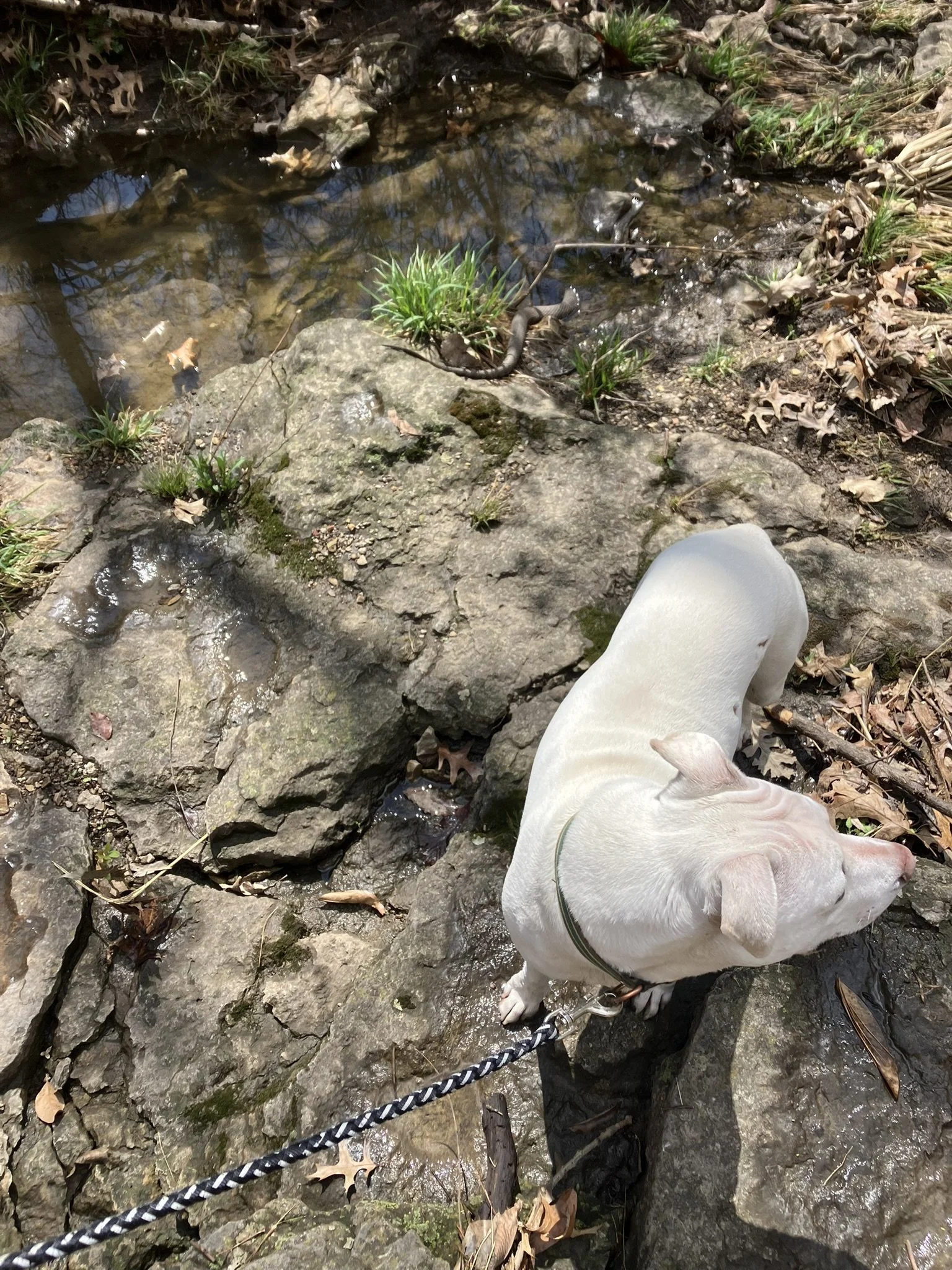 This week I encountered my first wild snake of the year. Hazel the Dog and I bushwhacked off the paths to a creek I know and burst through the bustling green briar and honeysuckle to the limestone bedrock and the little stream. I was a tad joyous and pranced on the rocks. Suddenly, a MASSIVE something flashed.